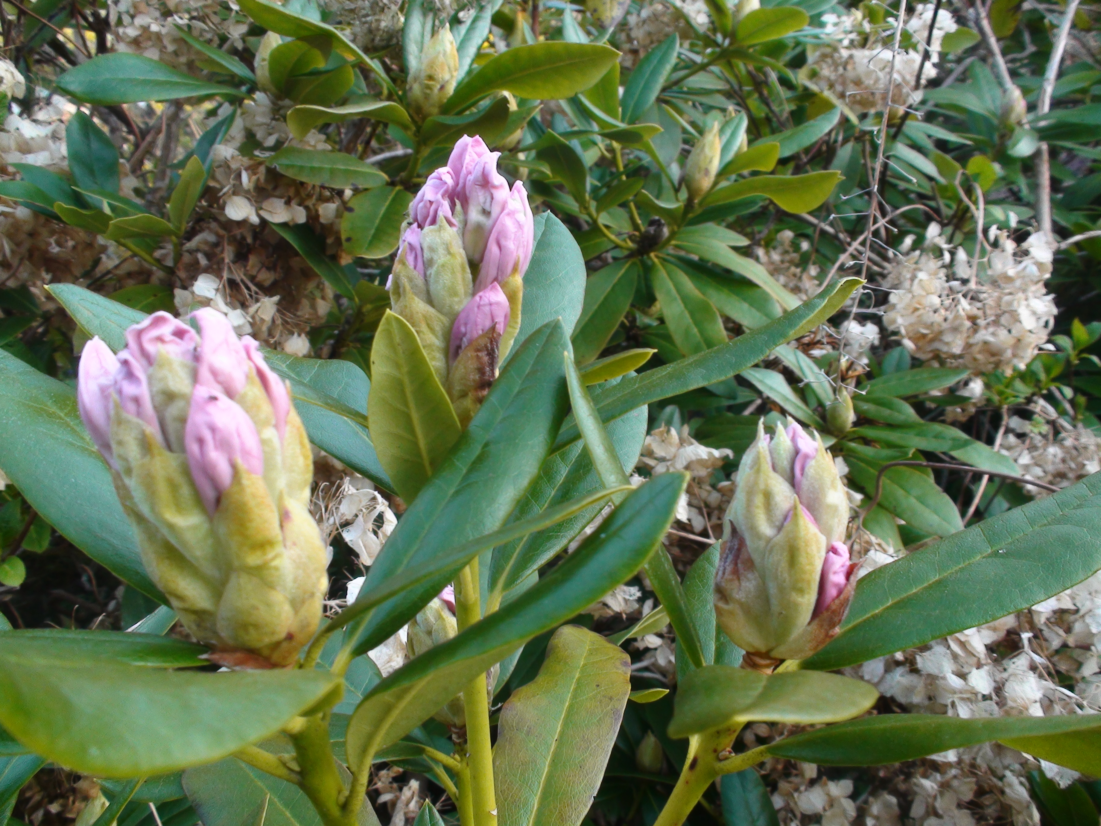 Rhododendron er i ferd med å springe ut, og Mahoniaen er i full blomst.
